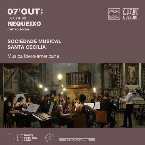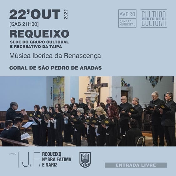 No próximo dia 7 de Outubro, às 21h30 no Centro Social de Requeixo, atuará a Sociedade Musical Sta Cecília (São Bernardo) e no dia 22 de Outubro, às 21h30 no Salão Polivalente de N. Srª de Fátima, atuará o Coral de São Pedro de Aradas.