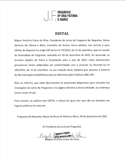 Miguel António Costa da Silva, Presidente da Junta de Freguesia de Requeixo, Nossa Senhora de Fátima e Nariz, torna público que, por deliberação da Junta de Freguesia em reunião ordinária, concede tolerância de ponto aos trabalhadores em funções nos dias 23 e 30 de dezembro de 2022.