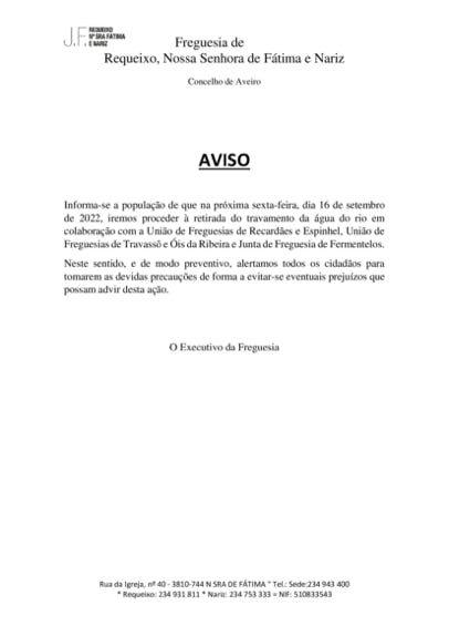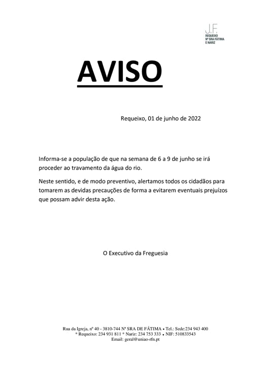 Informa-se a população de que na semana de 6 a 9 de junho se irá proceder ao travamento da água do rio.