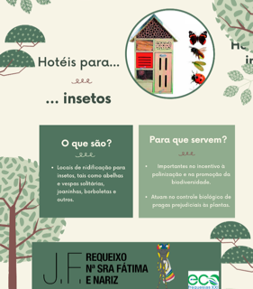No caso da Freguesia de Requeixo, Nª Sra de Fátima e Nariz, polinizar é a palavra de ordem! Assim, foram instalados dois hotéis para insetos em espaços ajardinados da freguesia com o objetivo de aumentar a diversidade destes seres vivos essenciais na conservação da biodiversidade. O objetivo é, até ao fim do mandato, instalar pelo menos um hotel para insetos em cada lugar da Freguesia.
