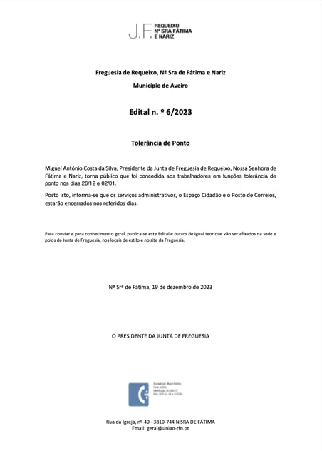 No passado dia 17 de fevereiro encerrou-se um processo iniciado no terceiro trimestre do ano transato que conduziu aos Autos de Transferências no âmbito da descentralização para as Autarquias Locais. É importante sublinhar que, desse entendimento com o Município de Aveiro, a Freguesia de Requeixo, N. Srª de Fátima e Nariz alcançou uma majoração de 15%, num total a transferir no ano de 2023 no valor de 150 054,30 €. Pelo contrário, as verbas transferidas pela Administração Central tiveram uma redução.