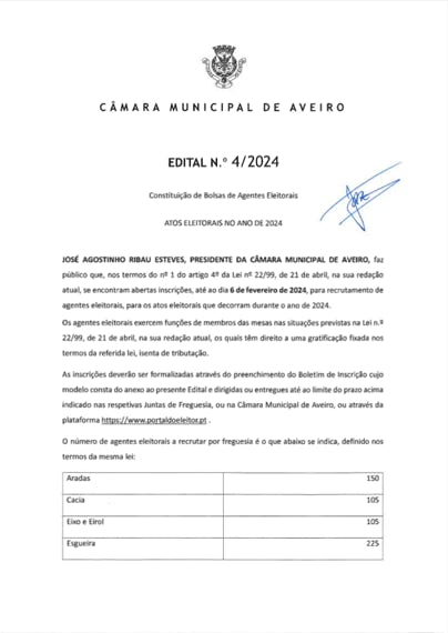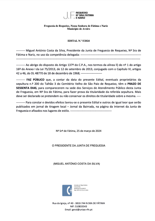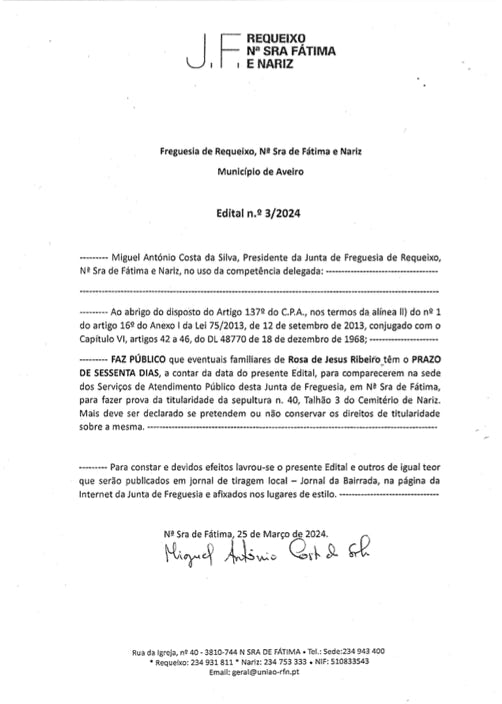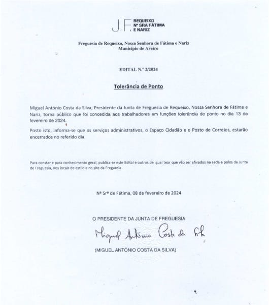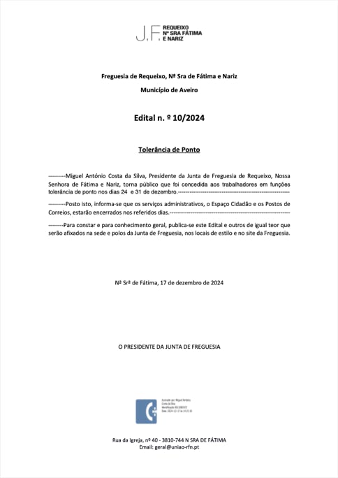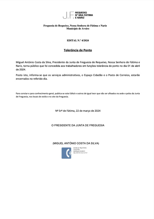 Miguel António Costa da Silva, Presidente da Junta de Freguesia de Requeixo, Nossa Senhora de Fátima e Nariz, torna público que foi concedida aos trabalhadores em funções tolerância de ponto no dia 01 de abril de 2024.