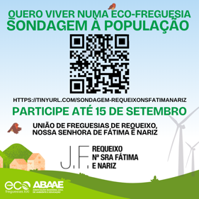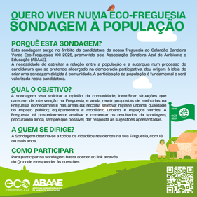 Esta sondagem surge no âmbito da candidatura da nossa freguesia ao Galardão Bandeira Verde Eco-Freguesias XXI 2025, promovido pela Associação Bandeira Azul de Ambiente e Educação (ABAAE).