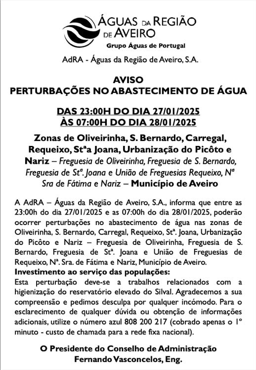 A AdRA – Águas da Região de Aveiro, S.A., informa que entre as 23h00 do dia 27/01/2025 e as 07h00 do dia 28/01/2025, poderão ocorrer perturbações no abastecimento de água nas zonas de Oliveirinha, S. Bernardo, Carregal, Requeixo, Stª Joana, Urbanização do Picôto e Nariz – Freguesia de Oliveirinha, Freguesia de S. Bernardo, Freguesia de Stª Joana e União de Freguesias de Requeixo, N. Srª de Fátima e Nariz, Município de Aveiro.