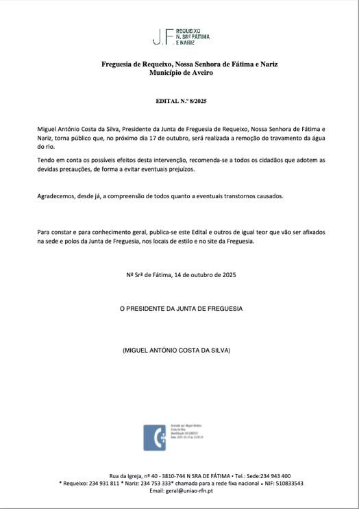 A AdRA – Águas da Região de Aveiro, S.A., informa que entre as 23h00 do dia 27/01/2025 e as 07h00 do dia 28/01/2025, poderão ocorrer perturbações no abastecimento de água nas zonas de Oliveirinha, S. Bernardo, Carregal, Requeixo, Stª Joana, Urbanização do Picôto e Nariz – Freguesia de Oliveirinha, Freguesia de S. Bernardo, Freguesia de Stª Joana e União de Freguesias de Requeixo, N. Srª de Fátima e Nariz, Município de Aveiro.